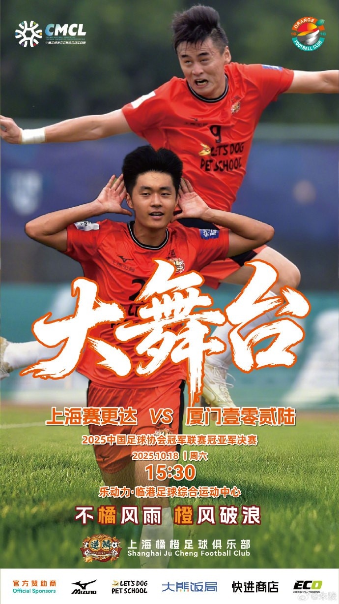 10月18日讯 中冠冠亚军争夺战首回合,上海橘橙将对阵厦门壹零贰陆。赛前,上海橘橙投资人兼球员朱骏发文:“演出倒计时,刷上场时间了。 ”中冠决赛阶段分组赛A组,上海橘橙7轮6胜1平夺得A组第一,获得参加2026中乙联赛的资格。在上海橘橙阵中,有着前国脚李建滨、张璐等球员,59岁的前上海申花老板朱骏,是这支球队的投资人兼球员。