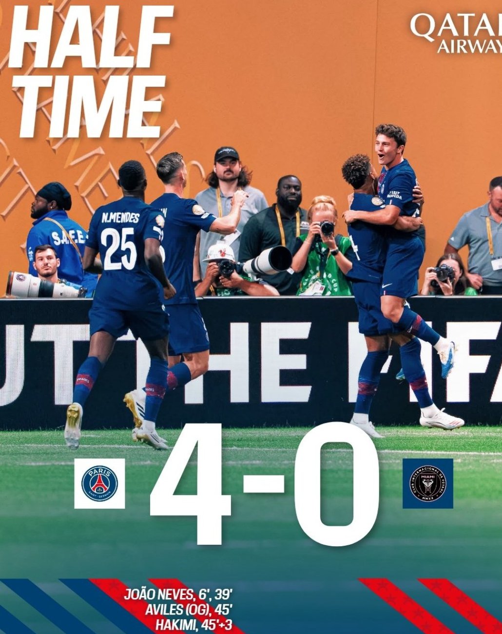 半场-巴黎全面压制4-0迈阿密 内维斯双响阿什拉夫破门迈阿密0射门